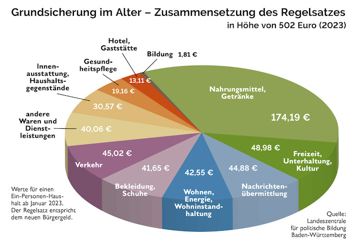 Die Höhe der Grundsicherung hängt vom Bedarf ab. Dazu zählt der Regelsatz (ein Grundbetrag), der 2023 für alleinstehende Personen 502 Euro und für Paare 902 Euro beträgt. Zusätzlich werden die Kosten für Unterkunft und Heizung sowie Leistungen für Bildung und Teilhabe als Bedarf berücksichtigt. Die Bedarfe werden dem Einkommen und Vermögen gegenübergestellt, aus der Differenz errechnet sich die Höhe der Grundsicherung.