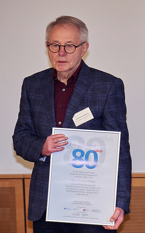 Unter den Preisträgern ist auch der 80-jährige Dietmar Peikert aus Köln. Er ist im Kölner Netzwerk von Nachbarschaftshilfen „Kölsch Hätz“ (Kölnisches Herz) aktiv, die eng mit den katholischen und evangelischen Kirchengemeinden zusammenarbeiten. Peikert engagiert sich mit unermüdlichem Einsatz und aus Überzeugung, um Menschen vor Isolation und Einsamkeit zu schützen. Die Initiative ist seit 25 Jahren in mittlerweile 29 Kölner Stadtteilen mit 600 Ehrenamtlichen aktiv. Das Netzwerk vermittelt Kontakte und Begegnungen im Stadtviertel.