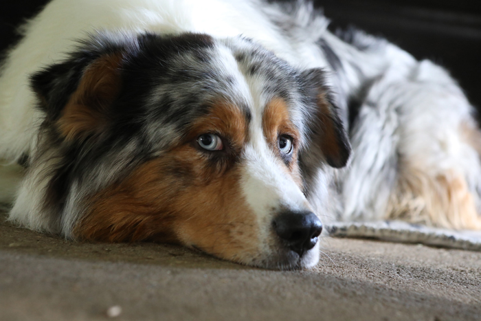 Auf dieser Nahaufnahme blickt der Hund Blue sehr eindringlich in die Kamera. Er beobachtet genau, was passiert. Foto: René Denzer