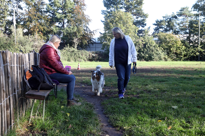 Es folgen weitere Übungen, bei denen das Zusammenspiel von Mensch und Tier beobachtet wird. Etwa wie der Australian Shepherd sich verhält, wenn er angeleint wird und seine Besitzerin sich entfernt. Hier wirkt der Vierbeiner etwas gestresst. Hampel gibt dazu Tipps und Hilfestellung. Später mimt die Hundetrainerin eine ältere Dame, die von Petra Haack und Blue begleitet über die Straße stolpert. Erschrickt das Tier vor den unkontrollierten Bewegungen? Nein, Blue bleibt gelassen. Ein Pluspunkt, den Hampel auf einem Notizblock vermerkt.