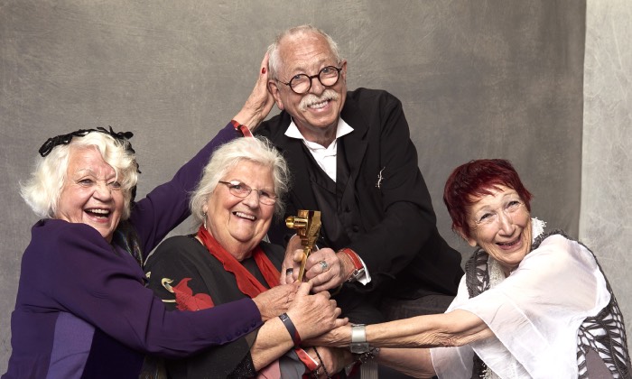 Sie haben eine große Fangemeinde – die Gruppe „Senioren Zocken“, von links: Ursula Cezanne, Melita Moritz (†), Peter Zeidler und Evelyn Gundlach. Hier 2018 bei der Preisverleihung des YouTube Goldene Kamera Digital Awards. Auf YouTube kann man ihre Tests neuer Online-Spiele verfolgen. Foto: Steffen Jänicke / Goldene Kamera