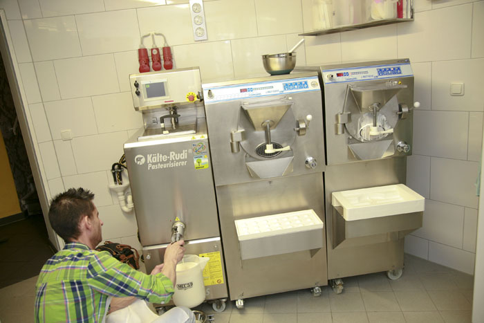 Die fertige Mischung kommt anschließend in die Eismaschine, in der das Eis seine cremige Konsistenz erhält. Foto: Dos Santos