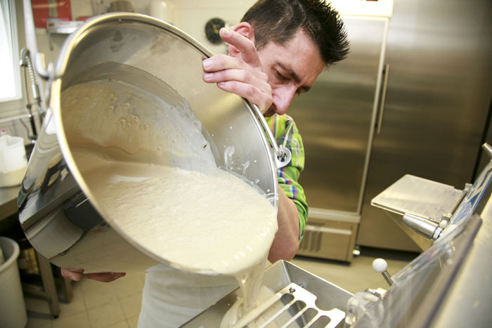 Nachdem Pietro Simari Milch, Sahne und Zucker im Pasteurisator auf 90 Grad erhitzt hat, füllt er die cremige Masse in einen Behälter ab. Foto: Dos Santos