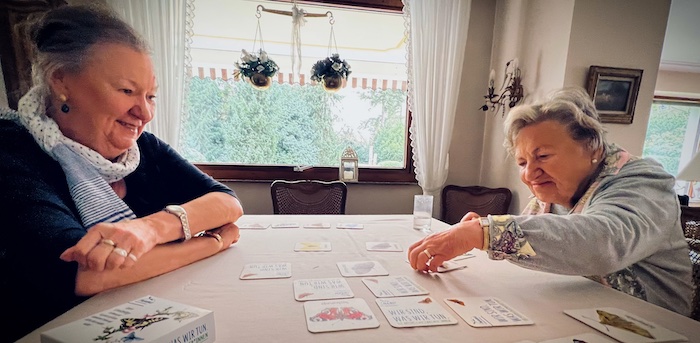 Gertie Schmitz-Mieden braucht nur noch ein weiteres Paar, dann ist ihr der Sieg sicher. Die 93-Jährige dreht eine der Karten vor ihr um. Sie zeigt einen Zitronenfalter. Unter welcher Karte befindet sich der andere? Schmitz-Mieden überlegt kurz und legt dann den zweiten frei. Ute Eisenmenger, die ihr gegenübersitzt, schüttelt den Kopf und lacht. „Ist das denn die Möglichkeit? Sie macht mich nass.“ Das sei genauso wie beim Doppelkopf. „Da verliere ich auch immer“, erzählt sie. Karten spielen Schmitz-Mieden und die 76-Jährige gerne zusammen.
