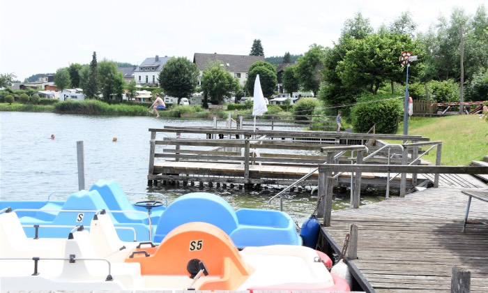 Die Stege und Stufen im Naturfreibad bieten auch hier einen komfortablen Zugang zum Badesee, auf dem man ebenfalls Ruder- und Tretboot fahren kann. Auch das Schalkenmehrer Maar bietet sich als Ziel für eine Wanderung oder Radtour an: um sich im See zu erfrischen oder in einem der vielen Restaurants und Cafés, die es im direkt am Maarsee gelegenen Schalkenmehren gibt.