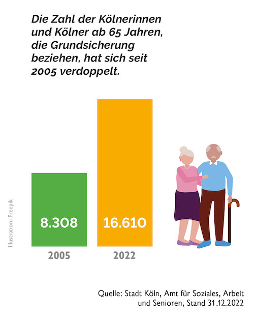 Ein Indiz, das hilft, den Umfang von Altersarmut festzustellen, ist die Zahl der Bezieher von Grundsicherung im Alter. Diese Sozialleistung erhält, wer im Rentenalter den notwendigen Lebensunterhalt nicht ausreichend aus eigenem Einkommen und Vermögen bestreiten kann und diese Hilfe beantragt hat. Für Köln gilt: Immer mehr Menschen ab 65 Jahren sind darauf angewiesen.