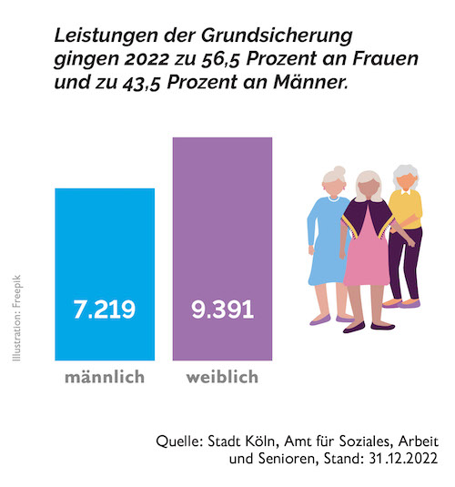 Altersarmut bleibt oftmals unsichtbar, bestätigt Martin Debener. „Eine Ausnahme von dieser Regel stellen ältere Flaschensammler dar. Diese Symbolfigur der Altersarmut gehört inzwischen zum Stadtbild – vor einigen Jahren gab es das in dieser Form noch nicht“, ergänzt er. Und auch in den Schlangen bei den Ausgabestellen der Kölner Tafel sind immer mehr Ältere zu sehen. Dass außerdem Frauen deutlich häufiger von Altersarmut betroffen sind als Männer, bestreitet keiner der Experten. Ende 2022 waren 56,5 Prozent der Grundsicherungsempfänger weiblich.