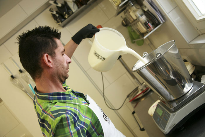 Nachdem Pietro Simari Milch, Sahne und Zucker im Pasteurisator auf 90 Grad erhitzt hat, füllt er die cremige Masse in einen Behälter ab. Foto: Dos Santos