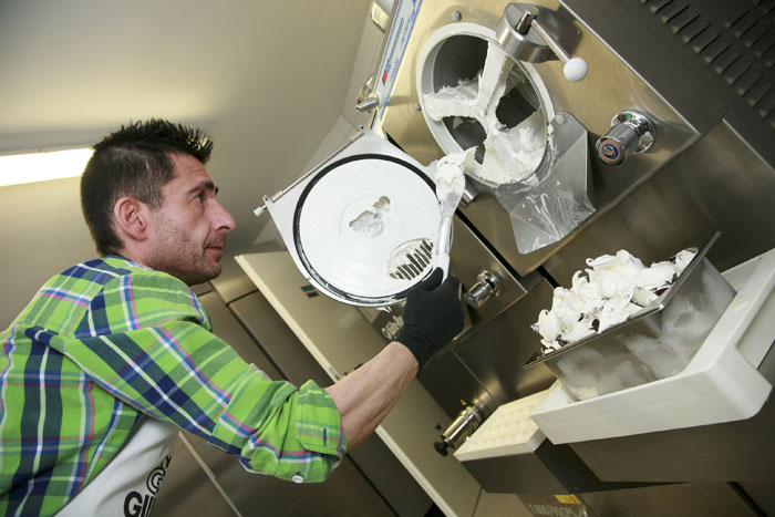 Zuletzt wird das Eis servierfertig verfeinert und kommt anschließend direkt in den Verkauf oder in die Kühlung.