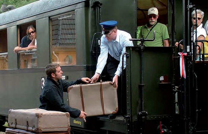 Schaffner in historischen Uniformen sowie alte Koffer und Ladegut gehören zum Bild der Sauerländer Kleinbahn. Foto: Peter Jung
