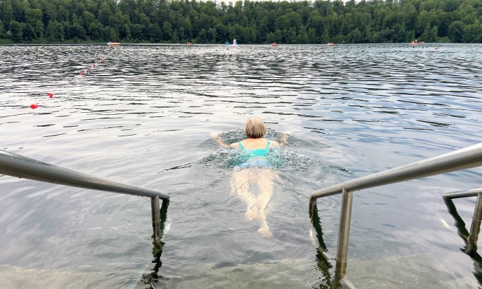 Frisch und wohltuend: schwimmen im Pulvermaar. Foto: Susanne Neumann