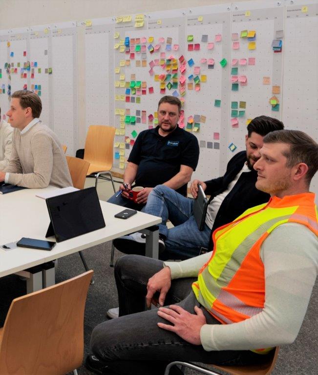 Die Baubesprechung erfolgt digital und analog. Die Zahl der Notizzettel an der Wand für die Planungsübersicht ist beachtlich. Foto: Thomas Banneyer